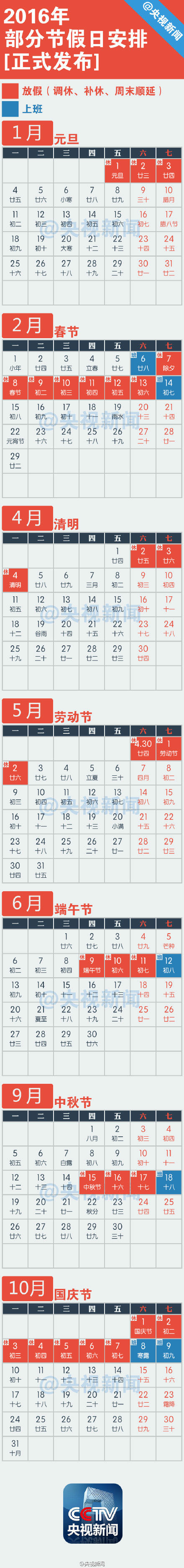 国务院办公厅关于2016年部分节假日安排的通知:①元旦:1月1日放假,与周末连休。②春节:2月7日至13日放假调休。2月6日、2月14日上班。③清明节:4月4日放假,与周末连休。④劳动节:5月1日放假,5月2日补休。⑤端午节:6月9日至11日放假调休。6月12日上班。⑥中秋节:9月15日至17日放假调休,共3天。9月18日上班。⑦国庆节:10月1日至7日放假调休,共7天。10月8日、10月9日上班。